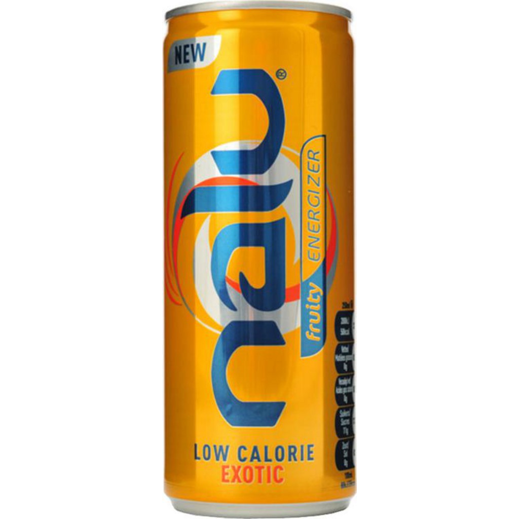 Nalu est une boisson énergissante à faible calories, idéale pour les sportifs, cette boisson fruitée est très connue en Belgique et au Luxembourg, sponsorisée par de nombreux sportifs est très agréable à boire. Eau gazéifiée, sucre, jus de fruits à base de concentré 4% (orange pêche, ananas, mangue), acidifiant (acide citrique), caféïne (0.03%), conservateur (sorbate de potassium), édulcorants (acésulfame-K, sucralose), antioxydant (acide ascorbique), vitamines (B3, E, B12), arômes, stabilisant (gomme guar), colorant (E160a).
