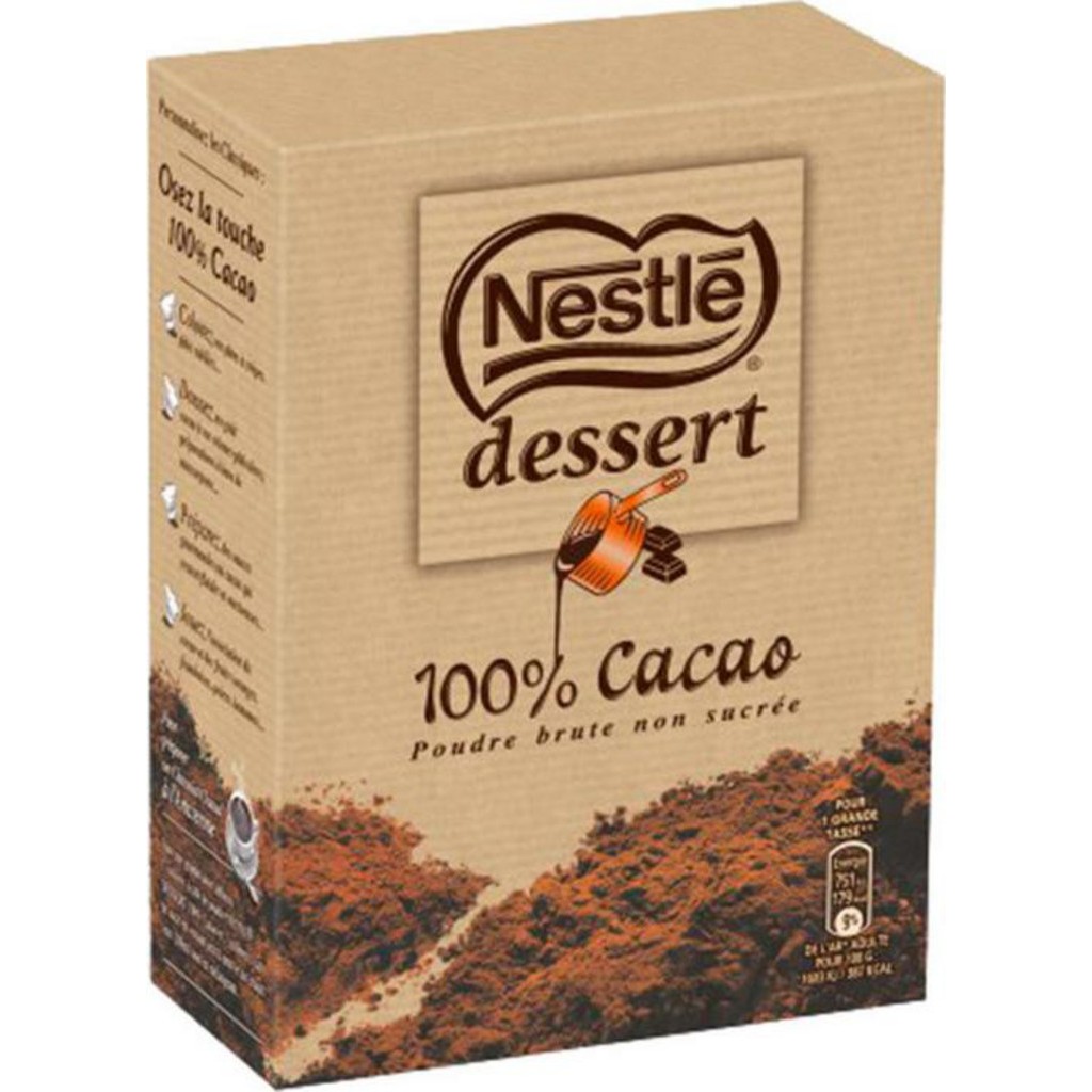 NESTLE DESSERT est une poudre brute non sucrée, idéale pour vos boissons et pâtisseries chocolatées. Tout le savoir-faire chocolatier de Nestlé Dessert en poudre. Colorez vos pâtes à crêpes, donnez un goût cacao à vos crèmes pâtissières, préparez des sauces gourmandes au cacao ou encore jouez l'association du cacao et des fruits. Lot économique de 3 boîtes. Cacao en poudre non sucré, correcteurs d'acidité (carbonates de potassium, hydroxyde de sodium).