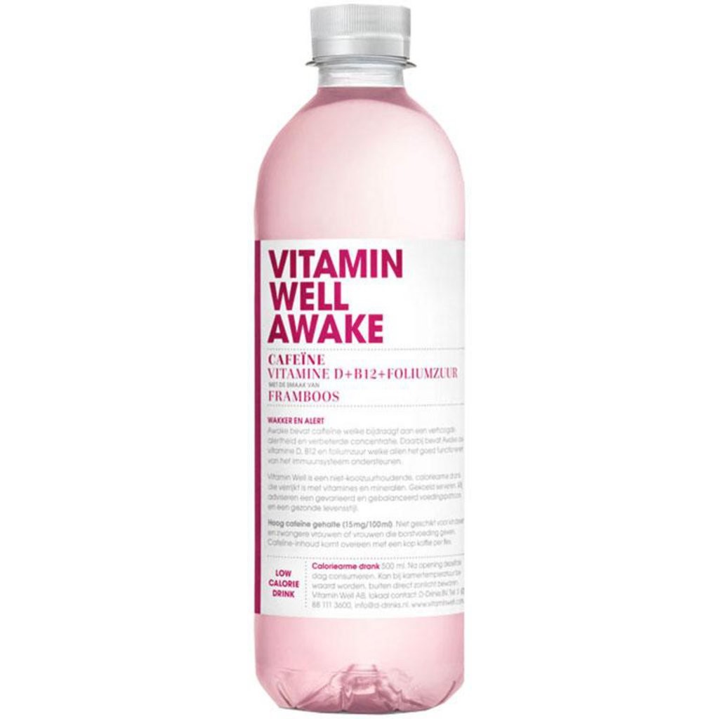 Awake contient vitamines D, vitamine B12 et vitamine E qui sont essentielles pour le métabolisme énergétique. Vitamin Well est une boisson faible en calorie enrichie en vitamines et minéraux. Eau, fructose, correcteurs d’acidité (acide citrique, citrates de sodium), extrait de sureau, caféine, vitamines (D3, E, niacine, acide folique, B12, biotine, acide pantothénique) minéraux (magnésium, zinc, sélénium), conservateur (sorbate de potassium, benzoate de sodium), arôme framboise, extrait des légumes colorant.